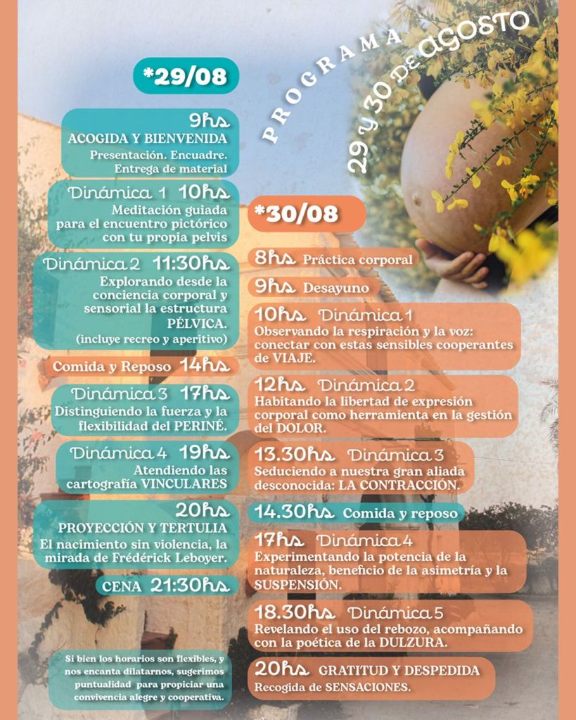 La experiencia es a través del movimiento, relacionando los fundamentos de conocimientos anatómicos con prácticas y ejercicios que amplían la consciencia corporal y sensorial dando valor al cuidado y la reflexión compartida trabajando desde una mirada sensible, respetuosa y amable que coopere en la prevención de posibles molestias y malestares que se nos presenten en la cotidianidad, aumentando así la confianza en los procesos fisiológicos y en el parto como vivencia segura y normal. Activándote desde la delicadeza, la dulzura y la dedicación continuas y constantes.